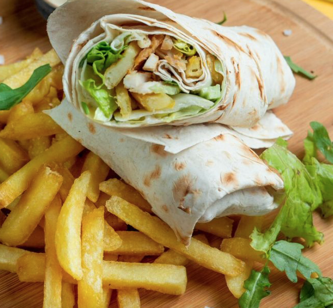 Grilled beef suya wrapped in naan wrap, with onions, tomato, red cabbage and a splash of house sauce.
